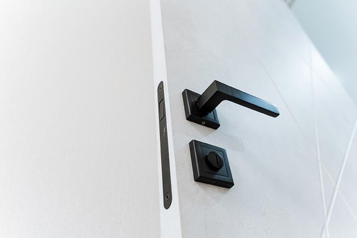 Nahaufnahme einer weißen Tür mit silbernem Türdrücker und Schlüsselloch